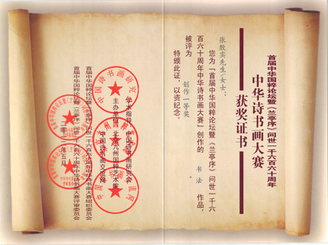 介绍: 首届中华国粹论坛暨《兰亭序》问世1660周年 中华诗书画大赛 荣获创作一等奖